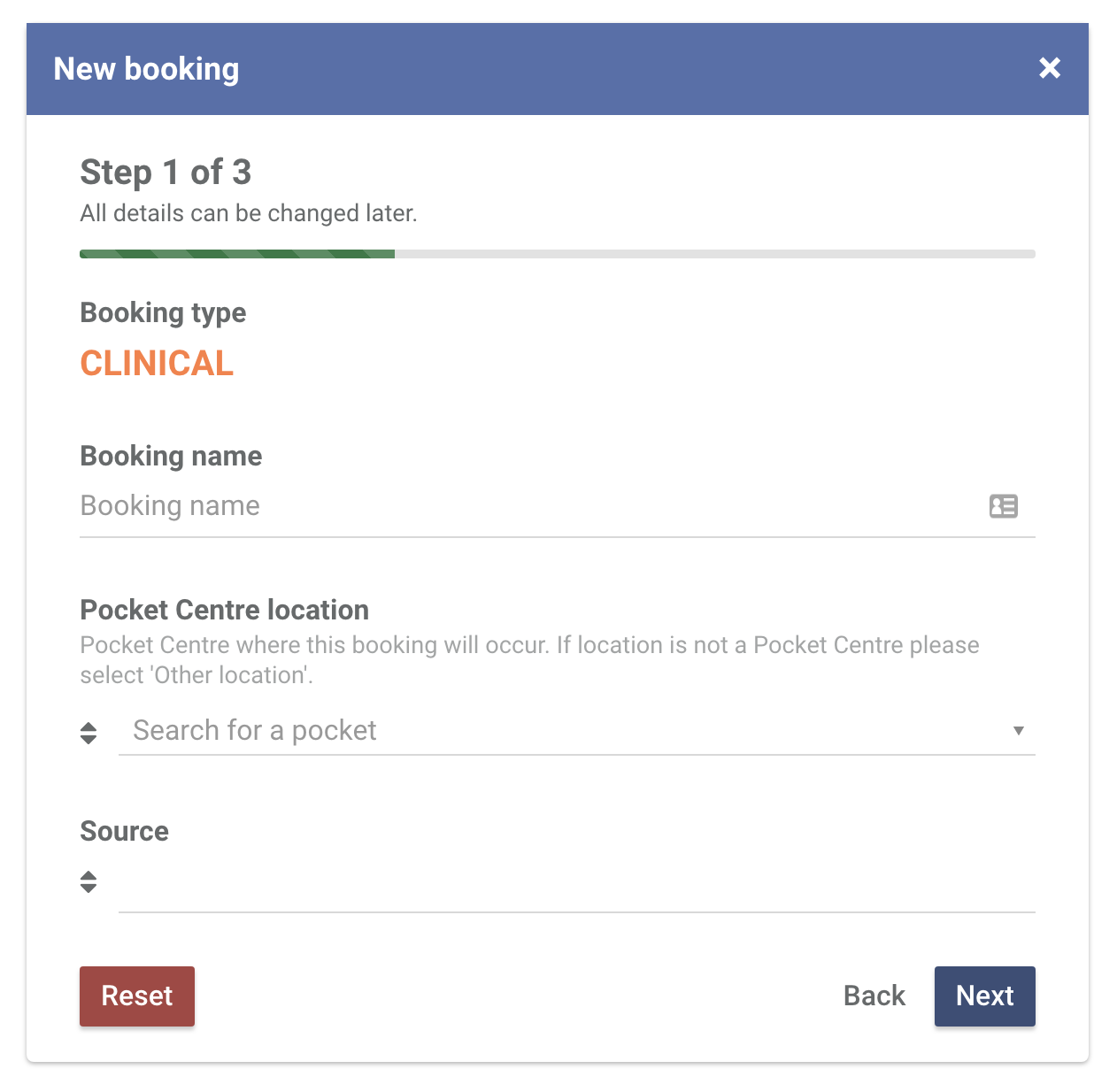 Unless the booking is happening outside of your Pocket Centre, select your own Pocket Centre as the location. Click Next.